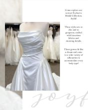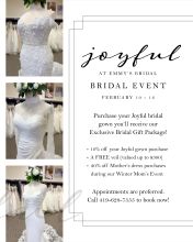 Join us for our kick-off event at to Celebrate our new partnership with Joyful, our newest Private Bridal collection. These simple elegant dresses are just what so many of today’s brides are looking for and they are available exclusively in this area at Emmy’s Bridal.